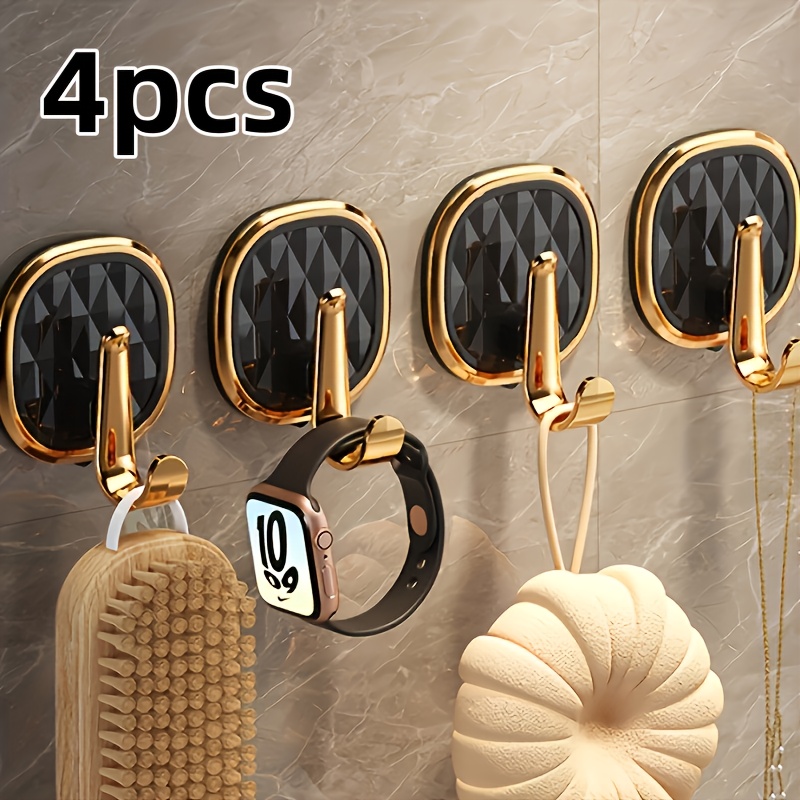 A Stylish Golden Wall-Mounted Hook for Robes And Towels Made of Rust-Resistant Plastic, Featuring a Chic Black Diamond Design. It Has a Strong Adhesive Suitable for Kitchens, Bathrooms, And for Hanging Clothes Or Keys, Utility Hooks